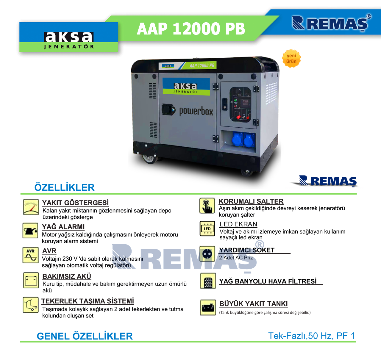 Aksa AAP 12000 PB Marşlı 12 kVA Monofaze Kabinli Dizel Jeneratör